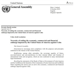 En cambio, el Proyecto de Resolución presentado por La Habana sí usa el término “embargo”. El título oficial del documento es “Necesidad de terminar el embargo económico, comercial y financiero impuesto por Estados Unidos de América a Cuba”, registrado por la 74 Asamblea General de la ONU como Proyecto de Resolución A-74-L6.